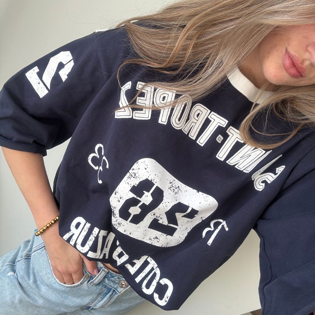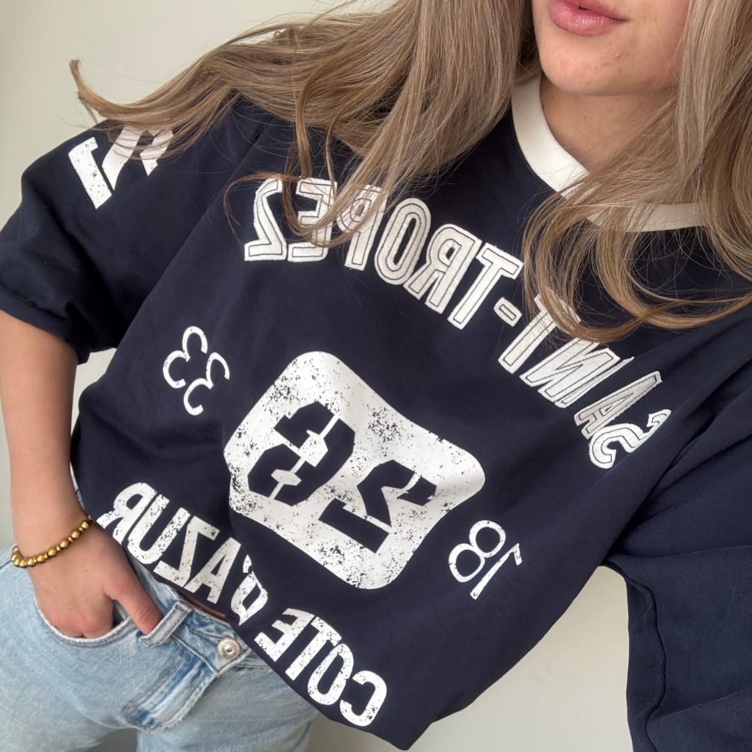 Dit donkerblauwe T-shirt met Saint Tropez print geeft jouw outfit direct een stoere, effortless vibe✨